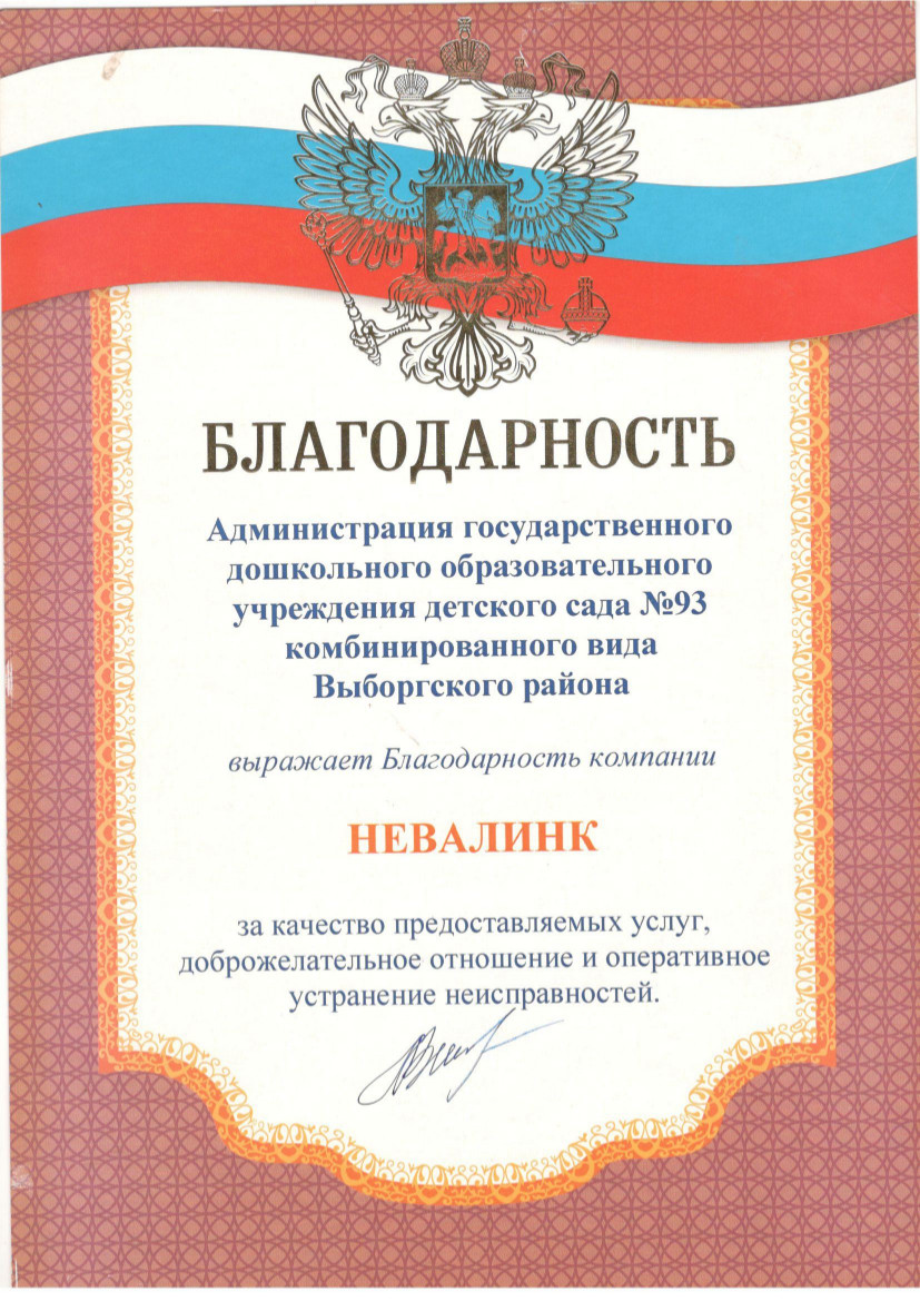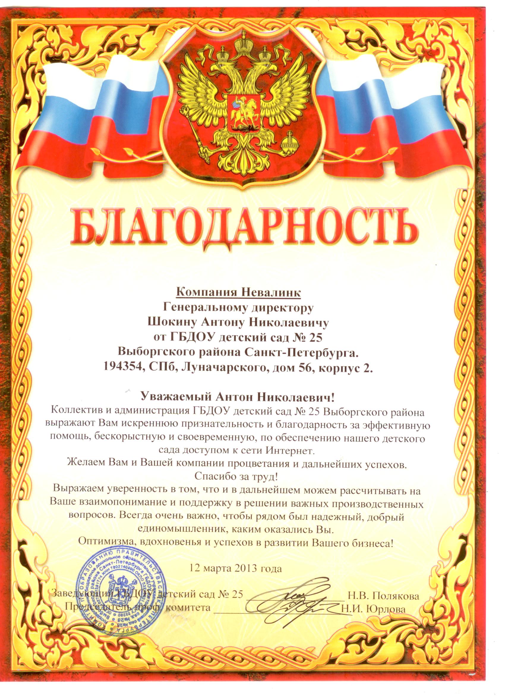 Коллектив и администрация ГБДОУ детский сад №25 Выборгского района выражают Вам искреннюю признательность и благодарность за эффективную помощь, бескорыстную и своевременную, по обеспечению нашего детского сада доступом к сети интернет. Желаем Вам и Вашей компании процветания и дальнейших успехов. Спасибо за труд!