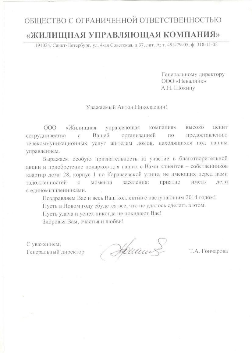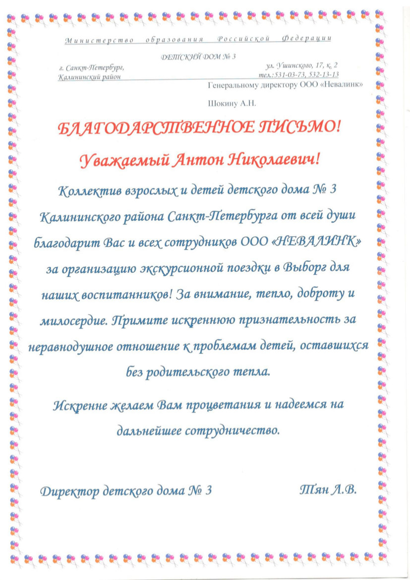 Уважаемый Антон Николаевич! Коллектив взрослых и детей детского дома №3 Калининского района Санкт-Петербурга от всей души благодарит Вас и всех сотрудников ООО »Невалинк«за организацию экскурсионной поездки в Выборг для наших воспитанников! За внимание, тепло, доброту и милосердие. Примите искреннюю признательность за неравнодушное отношение к проблемам детей, оставшихся без родительского тепла. Искренне желаем Вам процветания и надеемся на дальнейшее сотрудничество.