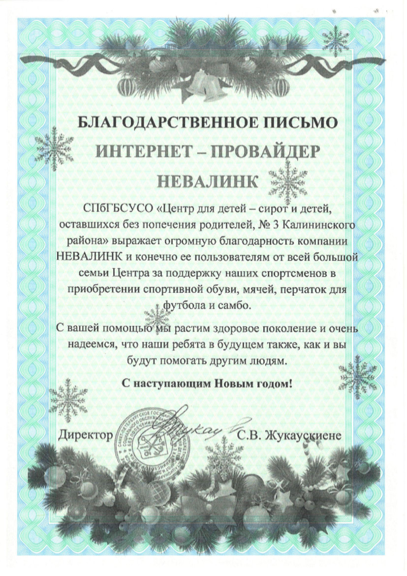 СПбГБСУСО «Центр для детей - сирот и детей, оставшихся без попечения родителей, №3 Калининского района»выражаем огромную благодарность компании ООО «Невалинк»и конечно ее пользователям от всей большой семьи Центра за поддержку наших спортсменов в приобретении спортивной обуви, мячей, перчаток для футбола и самбо. С Вашей помощью мы растим здоровое поколение и очень надеемся, что наши ребята в будущем также, как и Вы будут помогать другим людям.