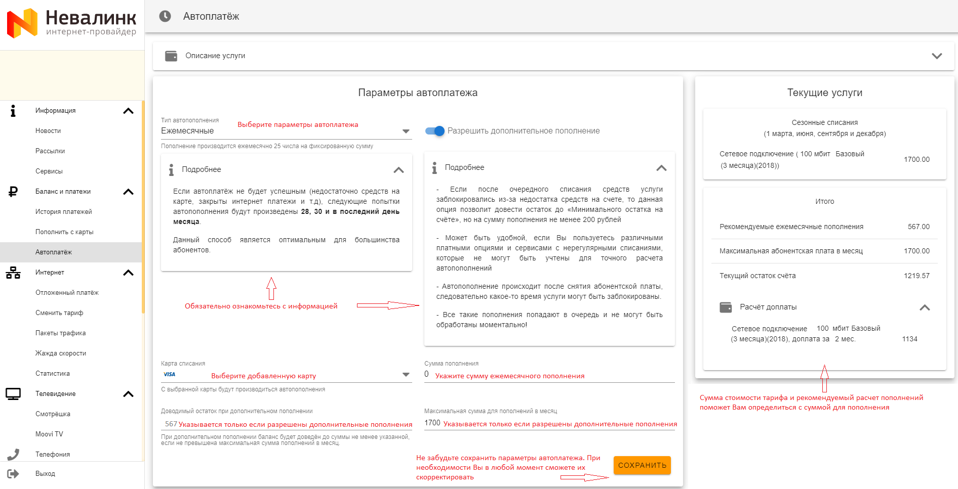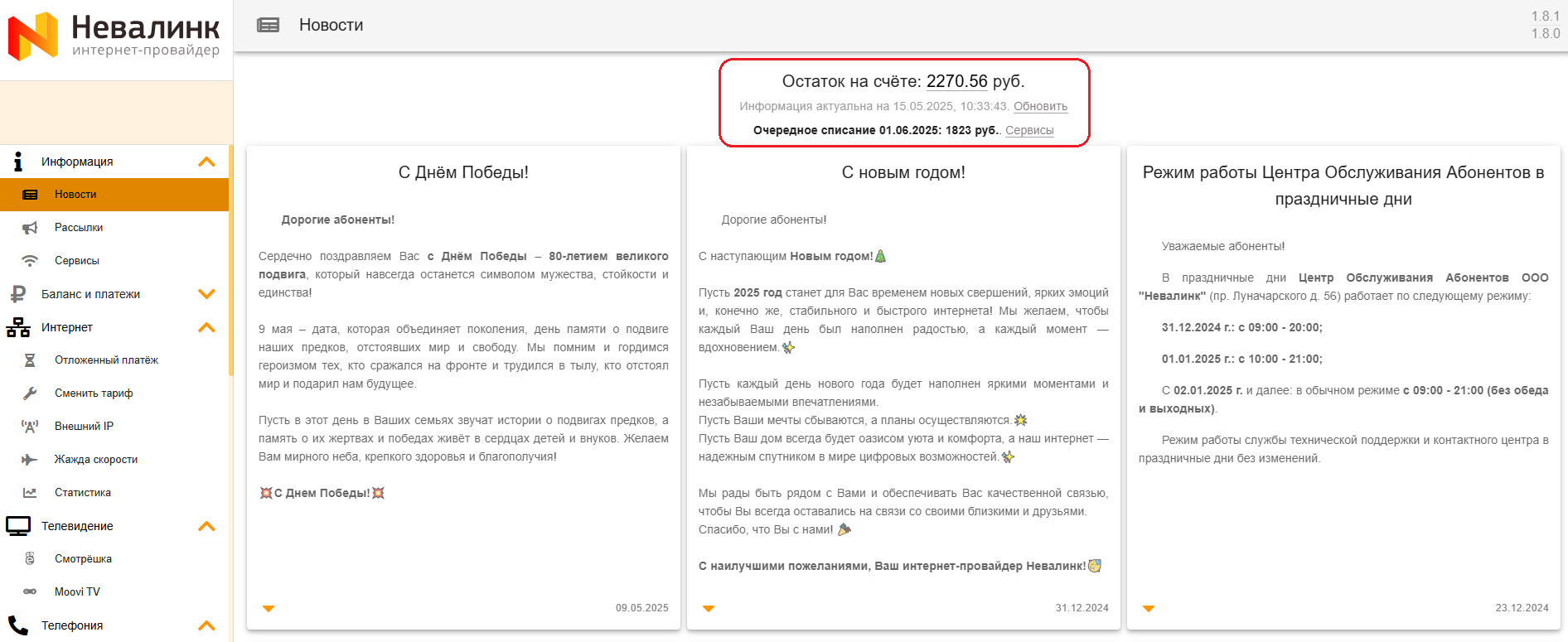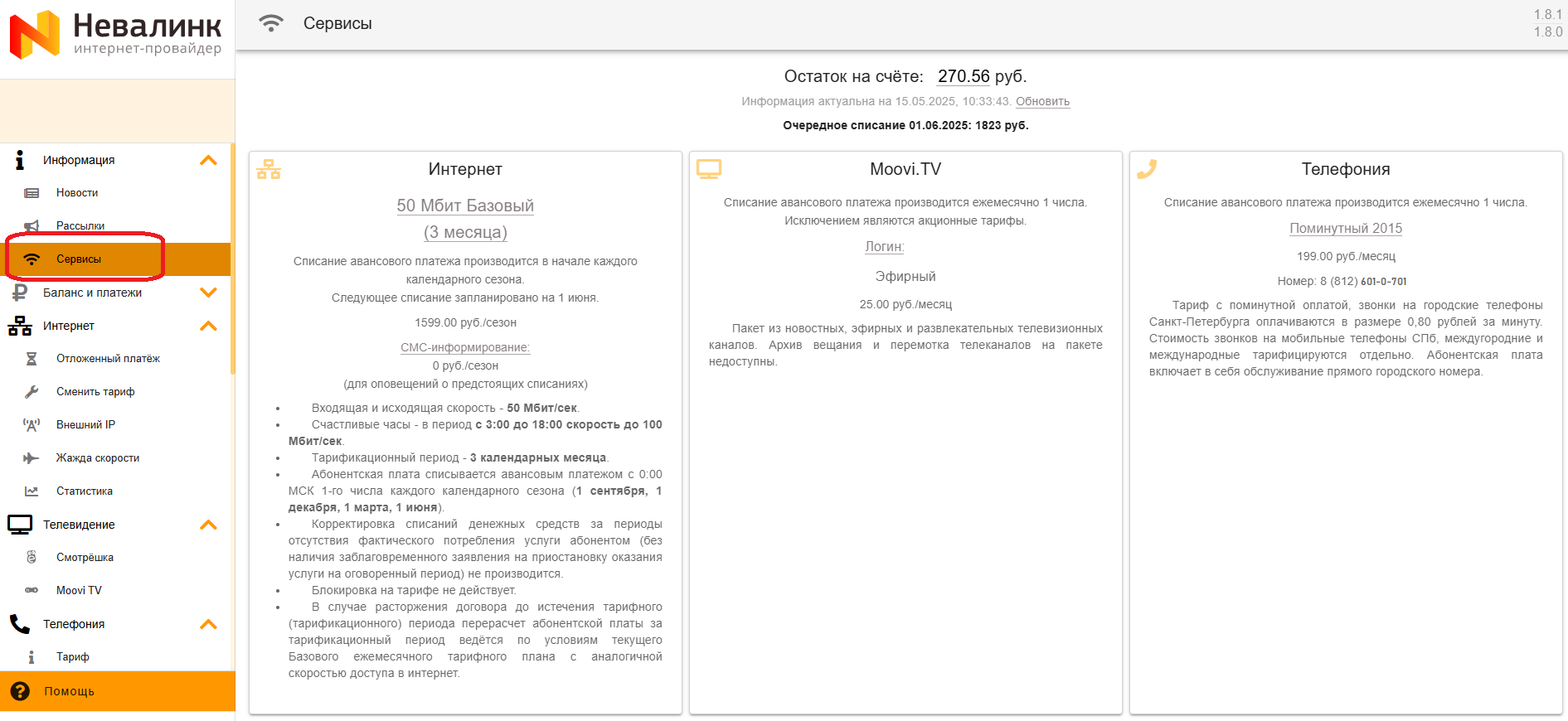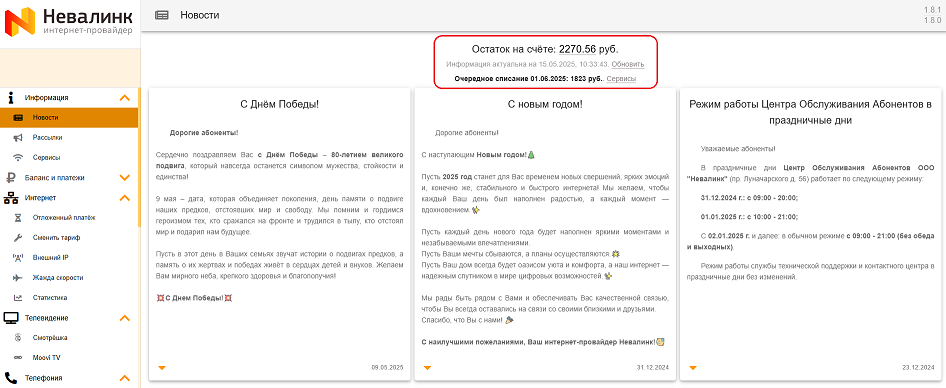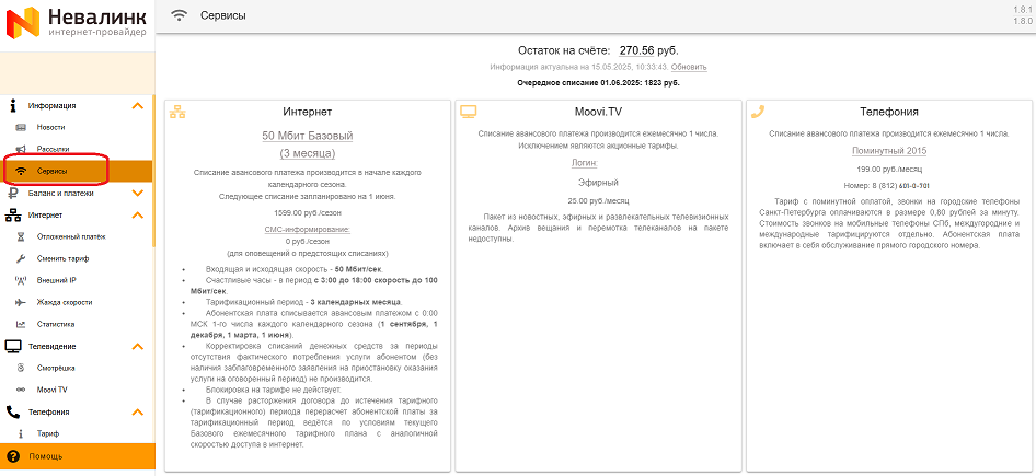 - Также на стартовой странице отображается сумма и дата очередного списания абонентской платы