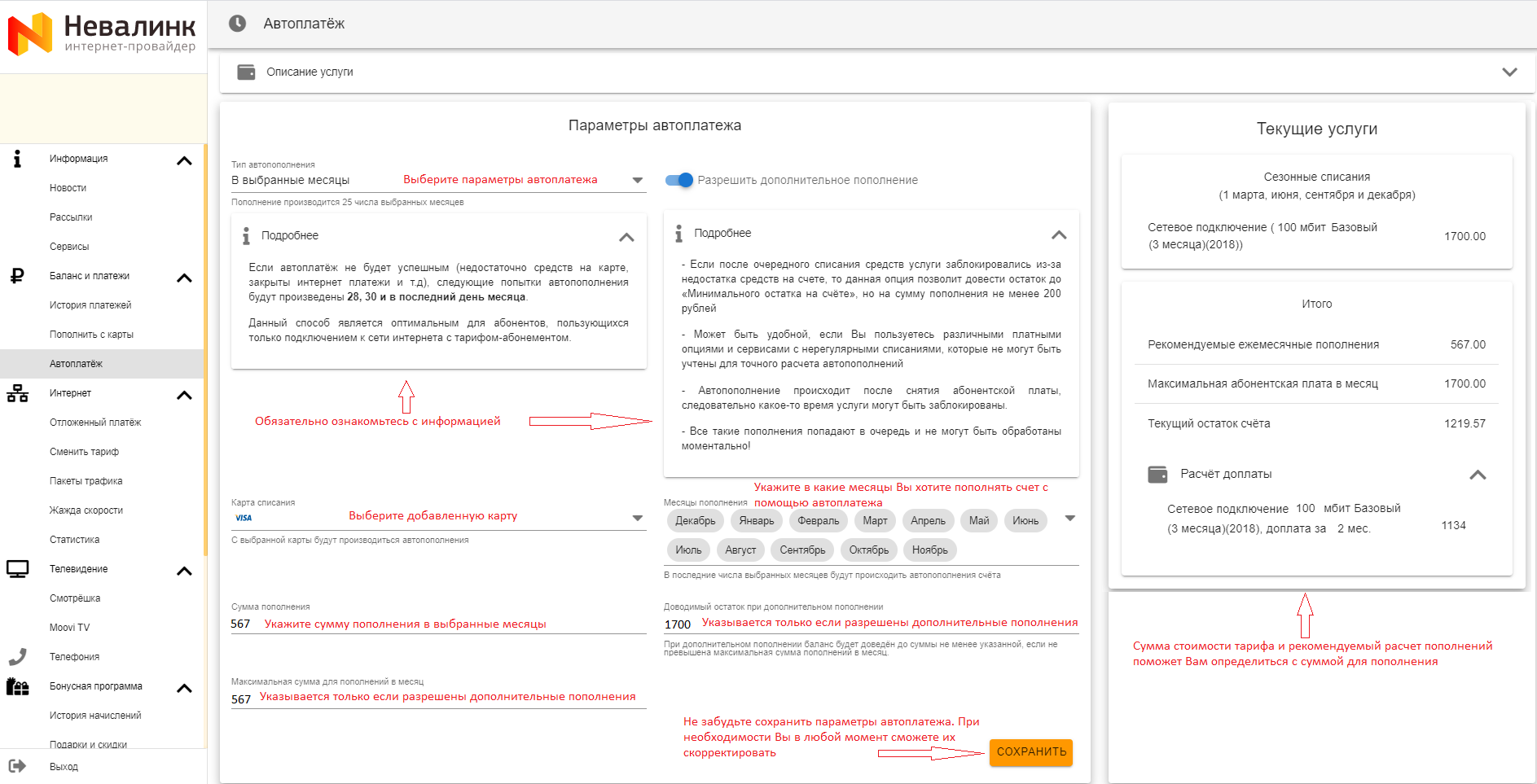 При дополнительном пополнении баланс будет доведён до суммы не менее указанной в поле «Доводимый остаток», но не превышая заданное значения в поле «Максимальная сумма для пополнений в месяц».- В выбранные месяцы - пополнение производится 25 числа выбранных месяцев.