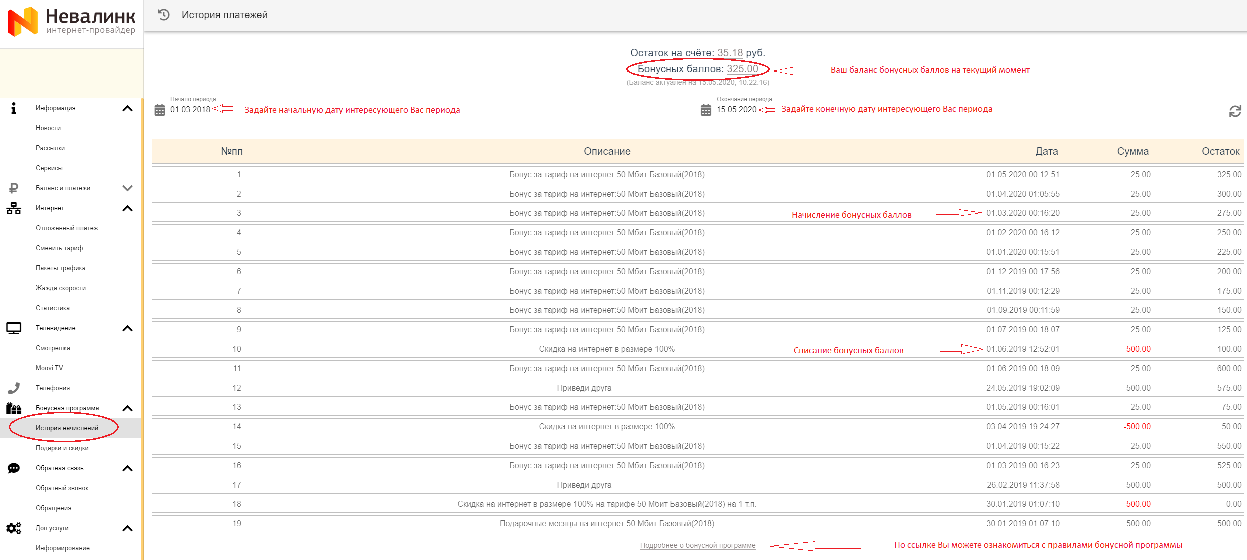 Подробная детализация по начислению и списанию бонусных баллов доступна: