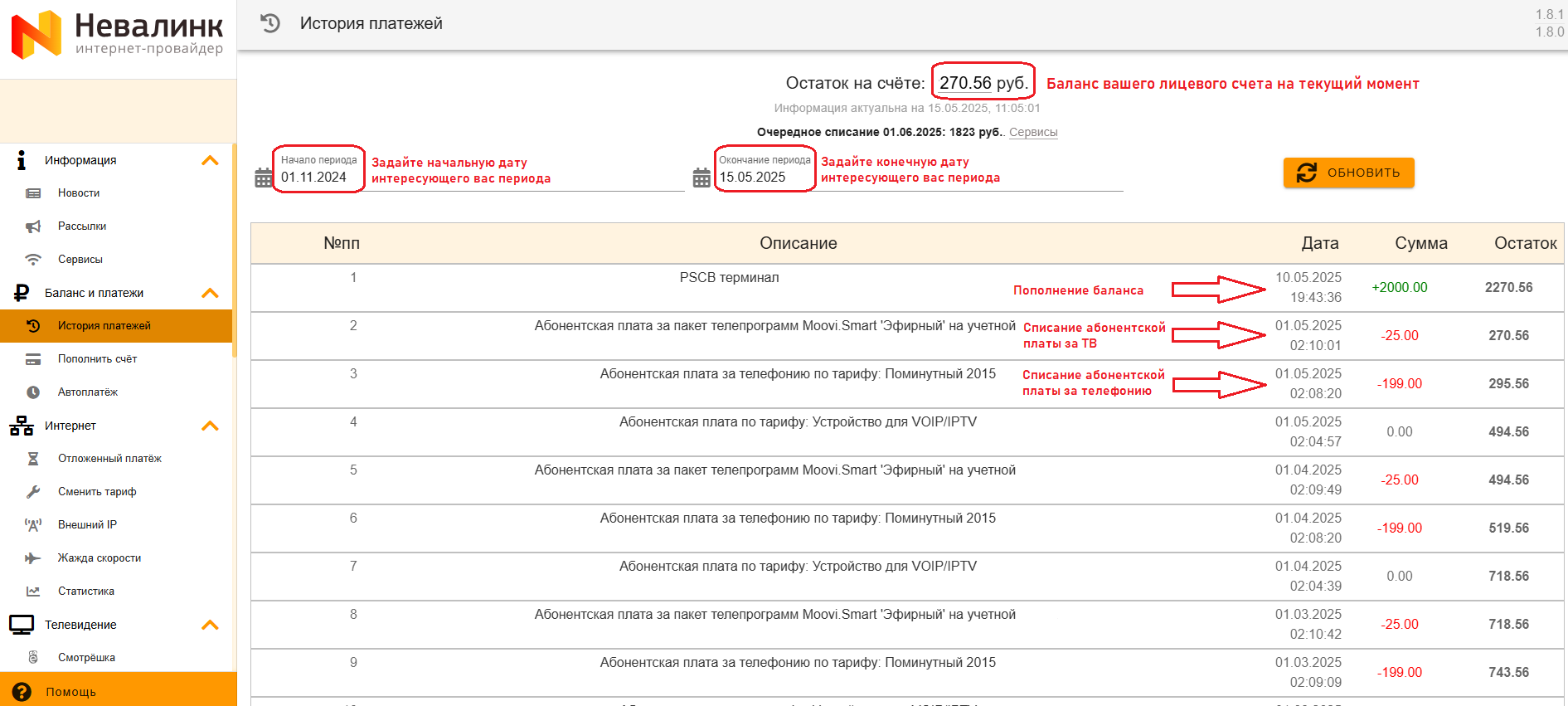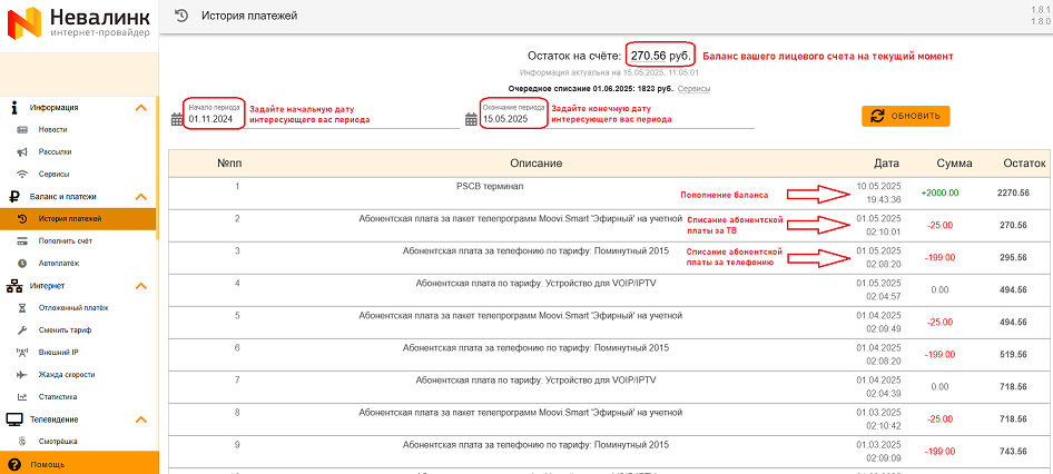 - Просмотреть подробную детализацию по балансу Вы можете в разделе «Баланс и платежи» -- «История платежей». При необходимости задайте интересующий Вас период для отображения.