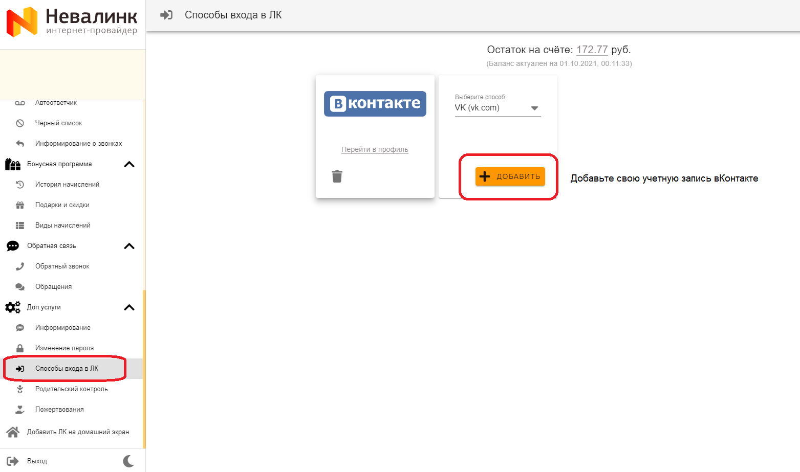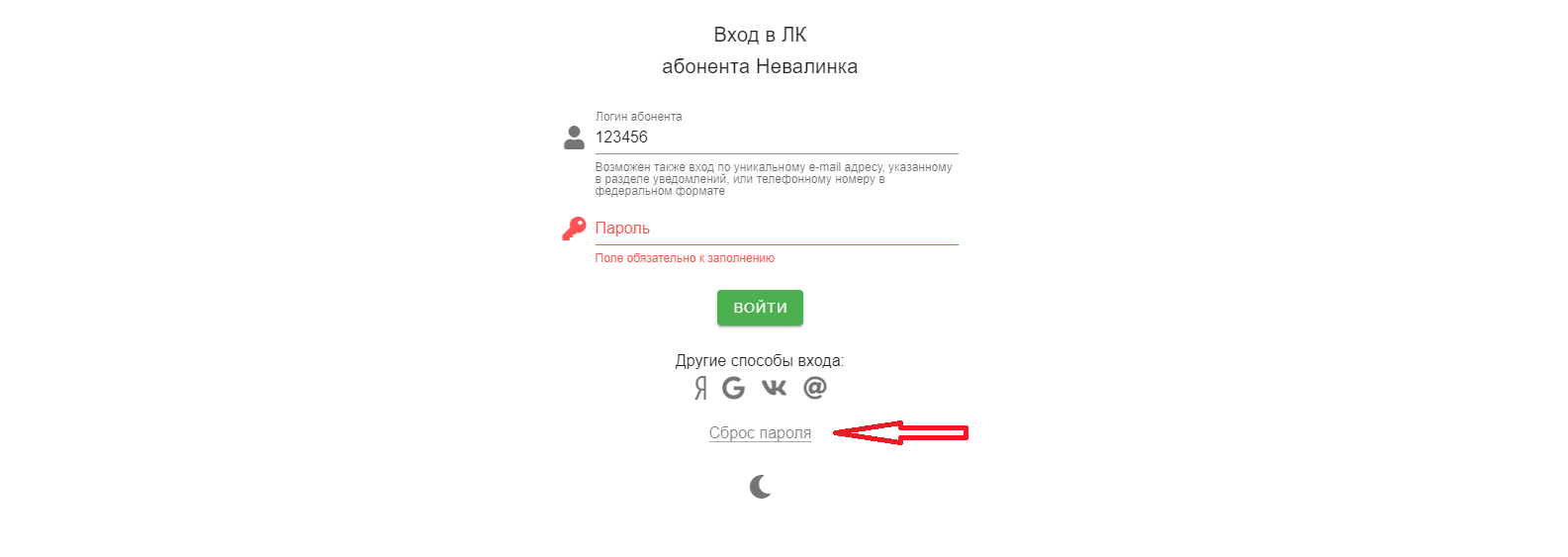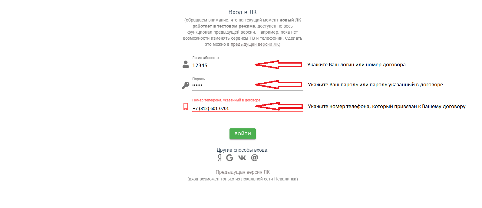 Для использования альтернативного способа авторизации предварительно необходимо привязать учетную запись в личном кабинете в разделе: Доп. услуги -- Способы входа в ЛК