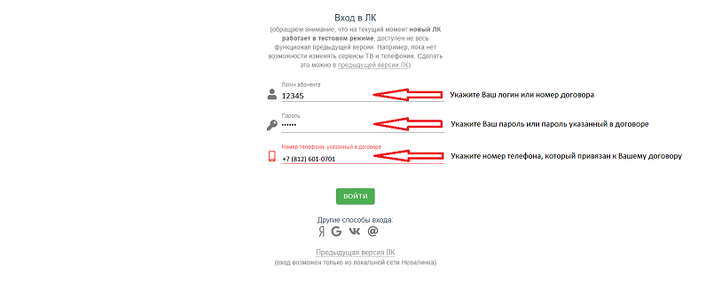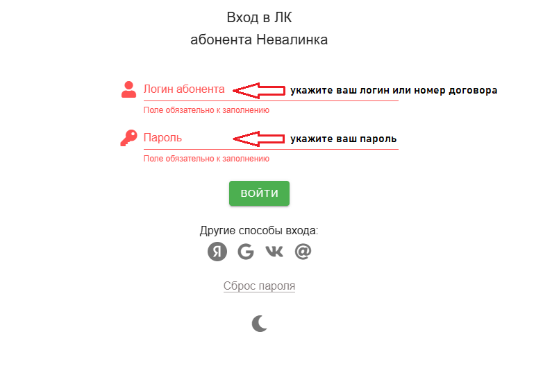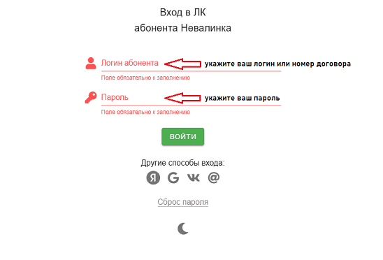 - Для авторизации из сети Невалинк используйте Ваш логин или номер договора и пароль, которые указаны в договоре.