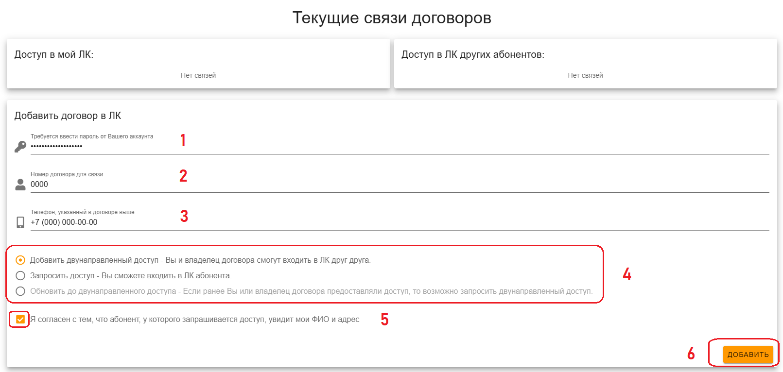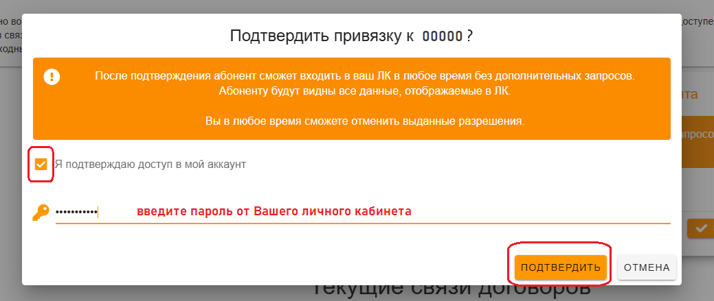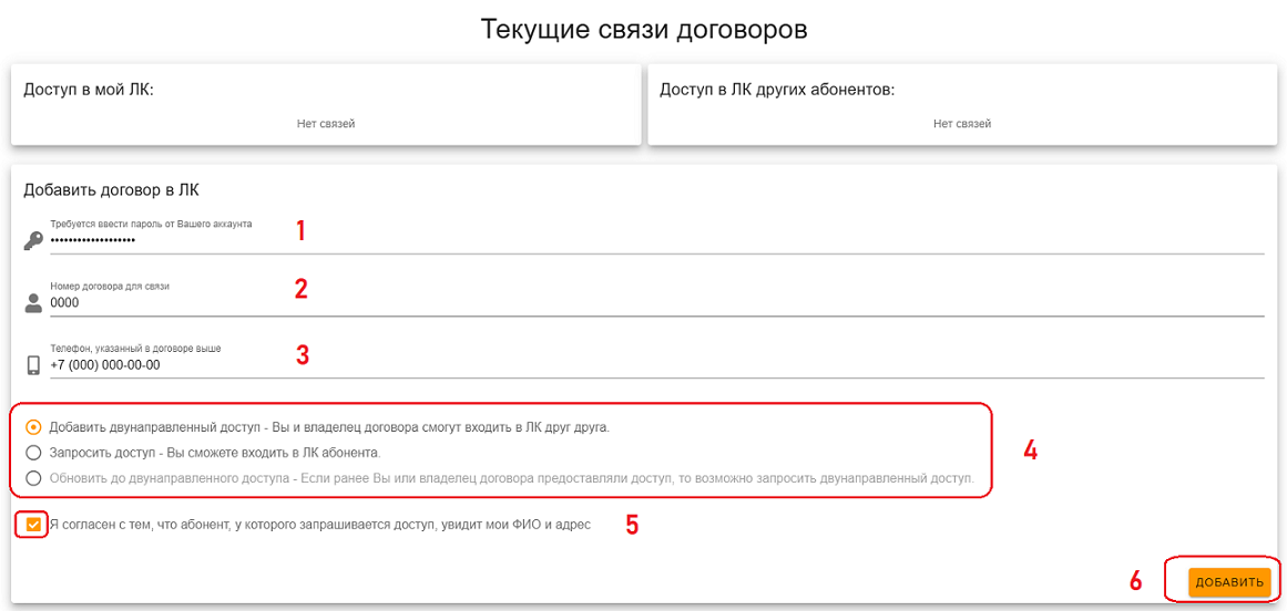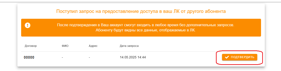 Обратите внимание! Отправляя запрос на предоставление доступа Вы соглашаетесь с тем, что получатель запроса увидит Ваши ФИО и адрес. Когда Вы запрашиваете доступ к чужому аккаунту, его владелец видит всю информацию о Вас, включая ФИО, адрес и номер договора. При этом Вы видите только номер договора, который указываете в запросе. После подтверждения доступа со стороны владельца Вы сможете видеть его ФИО и адрес. Такая система обеспечивает дополнительную защиту, позволяя владельцу аккаунта убедиться, что доступ предоставляется доверенному лицу. Подтверждение потребуется с обеих сторон.