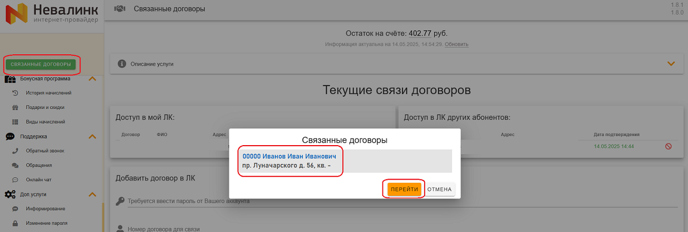 - В информации об аккаунте появляется кнопка "Связанные договоры";