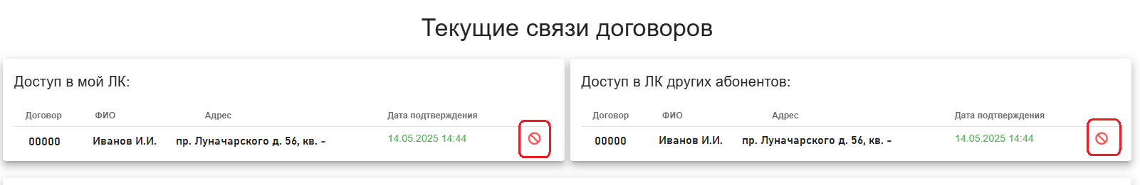 - Для удобства управления связанными аккаунтами после подтверждения запроса на доступ будут также видны адрес и ФИО владельца стороннего договора. До подтверждения эти данные недоступны целях безопасности персональных данных;