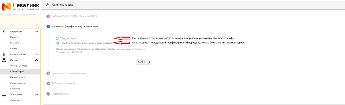 - На текущий тарификационный период, если при этом увеличивается период оплаты или стоимость тарифа