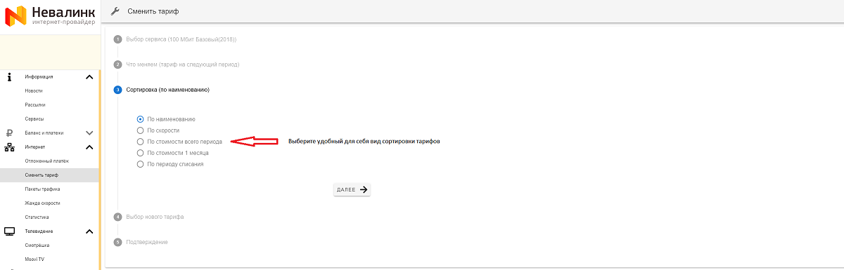 Вы можете указать удобный для себя вид сортировки тарифов, либо оставить значение по умолчанию