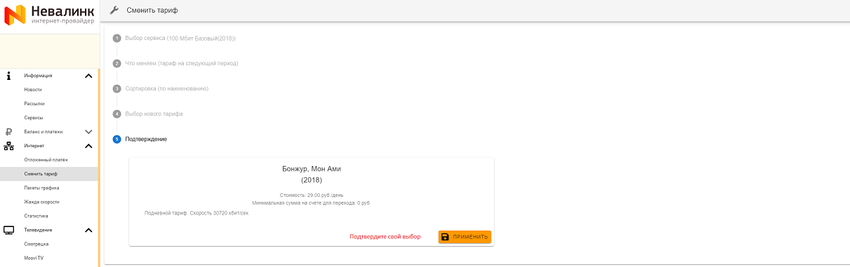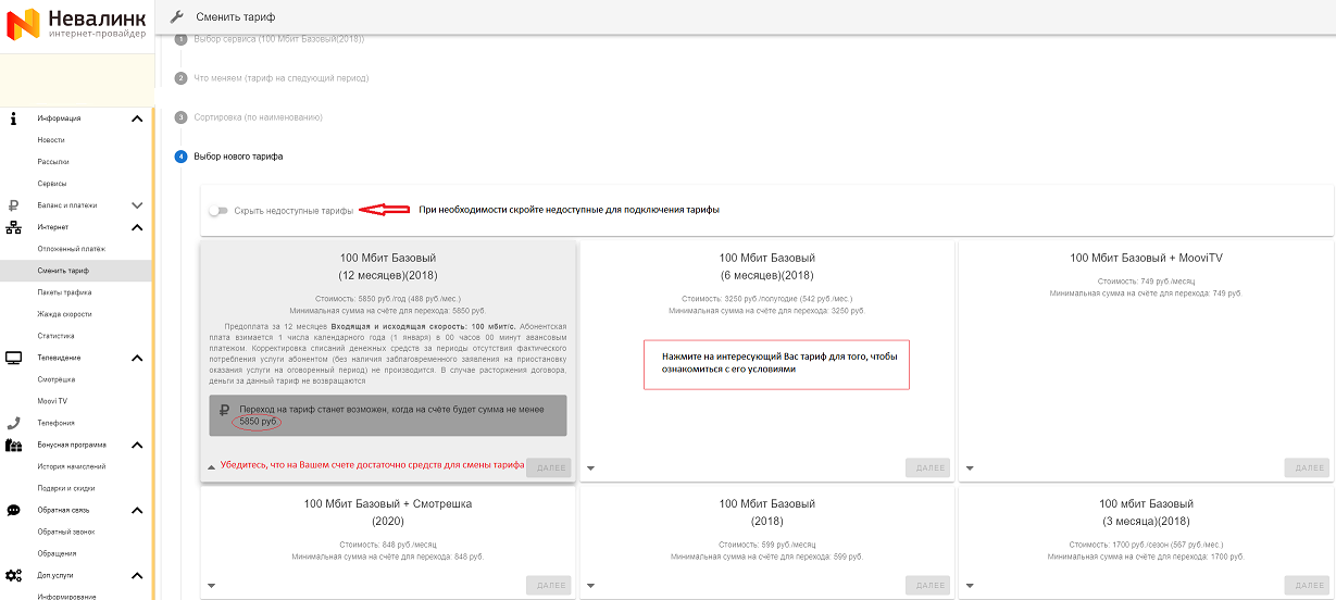 Подберите интересующий Вас тарифный план. Чтобы ознакомиться с условиями тарифа, просто щелкните левой клавишей мыши на интересующий Вас тариф. Убедитесь, что на Вашем счете достаточно денежных средств для перехода на выбранный Вами тариф