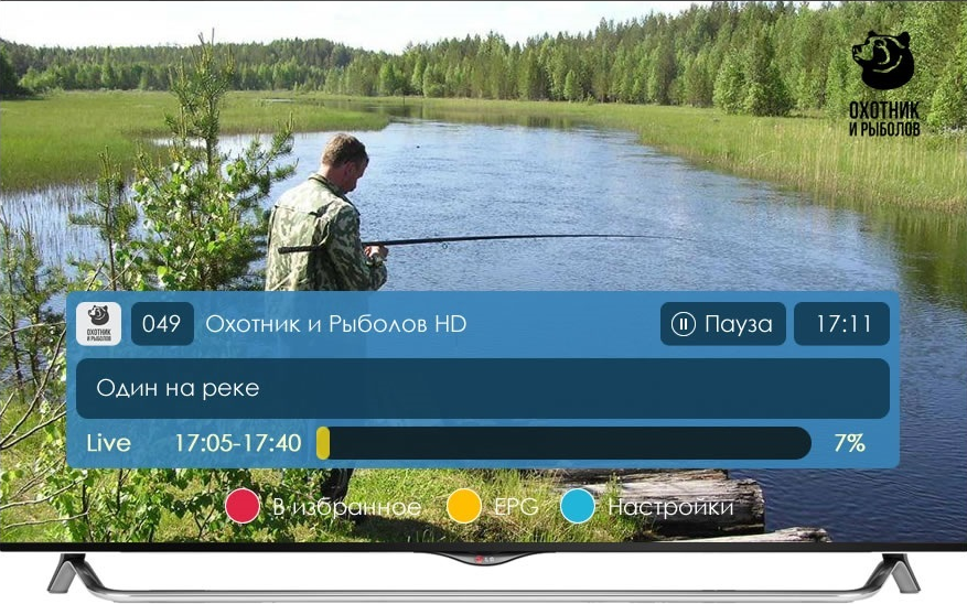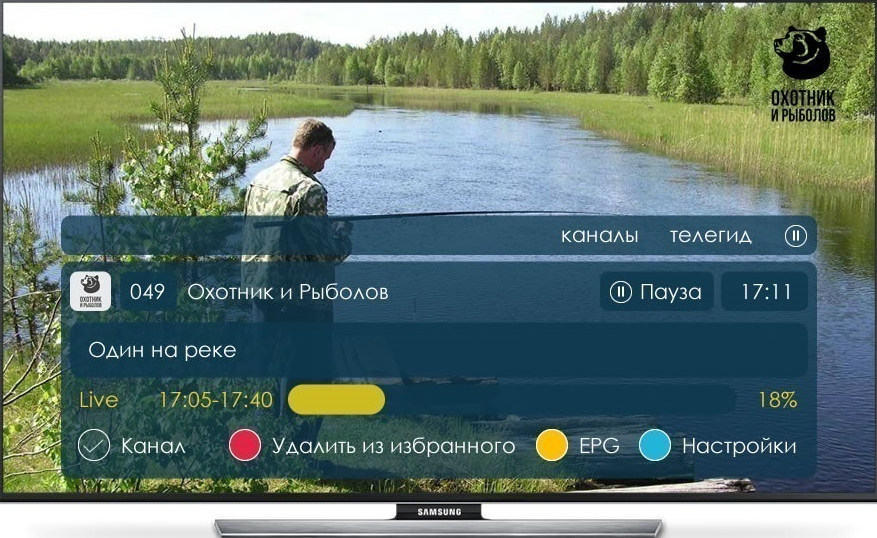 - Переключайте каналы кнопками «Р+» и «Р-» или цифрами «0-9». Для вызова панели управления просмотром нажмите кнопку «ОК» пульта управления. Вы можете прямой эфир на паузу кнопкой «||» или перемотать трансляцию на нужный момент кнопками перемотки вперед и назад. Красная кнопка добавляет канал в избранное. Желтая кнопка открывает программу передач. Синяя кнопка открывает меню настроек (управление аккаунтом).