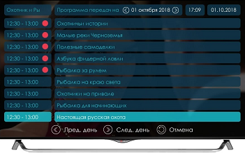 - Кнопка пульта управления «С» открывает список передач, где можно ознакомиться с телепрограммой или сразу перейти к просмотру передачи из архива. Список передач доступен за период до 7 дней.