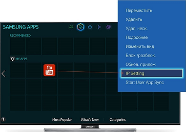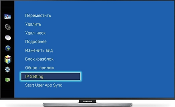 - Зайдите в «Smart Hub». Переведите курсор на одно из приложений (любое). Нажмите центральную кнопку-крестовину пульта и удерживайте ее до появлению Меню синхронизации. В появившемся меню выберите «IP Setting».